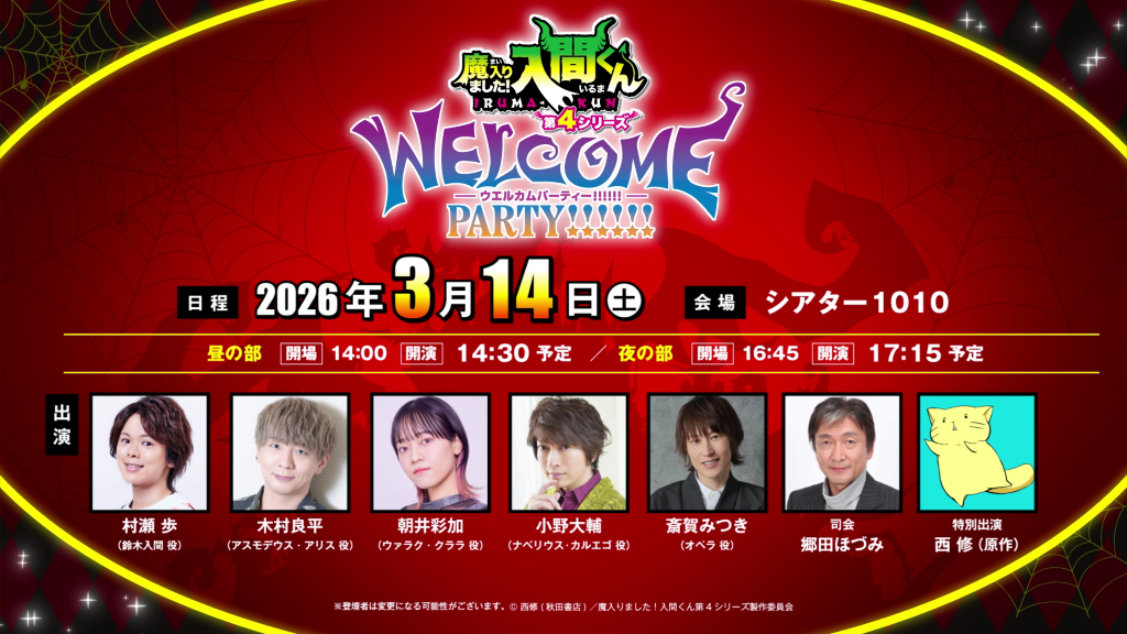 TVアニメ『魔入りました!入間くん』第4シリーズ 放送直前イベント「ウェルカム・パーティー」 26年3月14日(土)一日限りで開催決定 特別出演として原作・西 修先生 ほか 村瀬 歩、木村良平、朝井彩加、小野大輔、斎賀みつき豪華声優陣も出演決定!